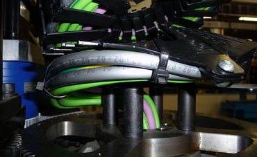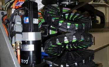 This machine is usually used for woodworking, whereby it could also be used for other materials which are similar to process (e.g. PVC, polypropylene, aluminum etc.). The tool has to be able to carry out numerous different movements in order to follow the workpiece contour, including rotating about its own axis with an overall rotation of 1440 degrees in both directions. For this reason, a solution was required for cable guidance to the tool which would be able to cope with this movement and is also light in terms of weight. The problem was solved in the past through the use of an electro pneumatic distributor that had significant weight, was too expensive and the absence of flexibility in adapting to a change was a further disadvantage. The igus® twisterband was absolutely convincing on all counts. The composition of 6 modules of the chain allows complete coverage of the required stroke. It is light weight and low cost.