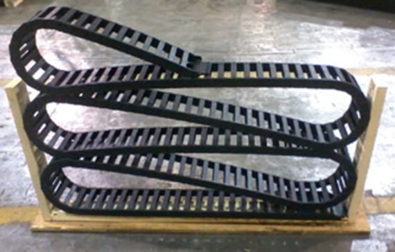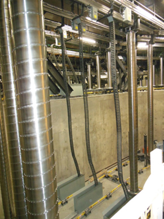The lifting system "Spiralift" is used in theatres and concert halls all over the world to raise and lower parts of the stage, for example. Since space is always tight under the stage and distances of more than 9 metres have to be covered, the data and power cables have to be routed very carefully. This is achieved using igus® e-chains® which are housed compactly in narrow metal containers.